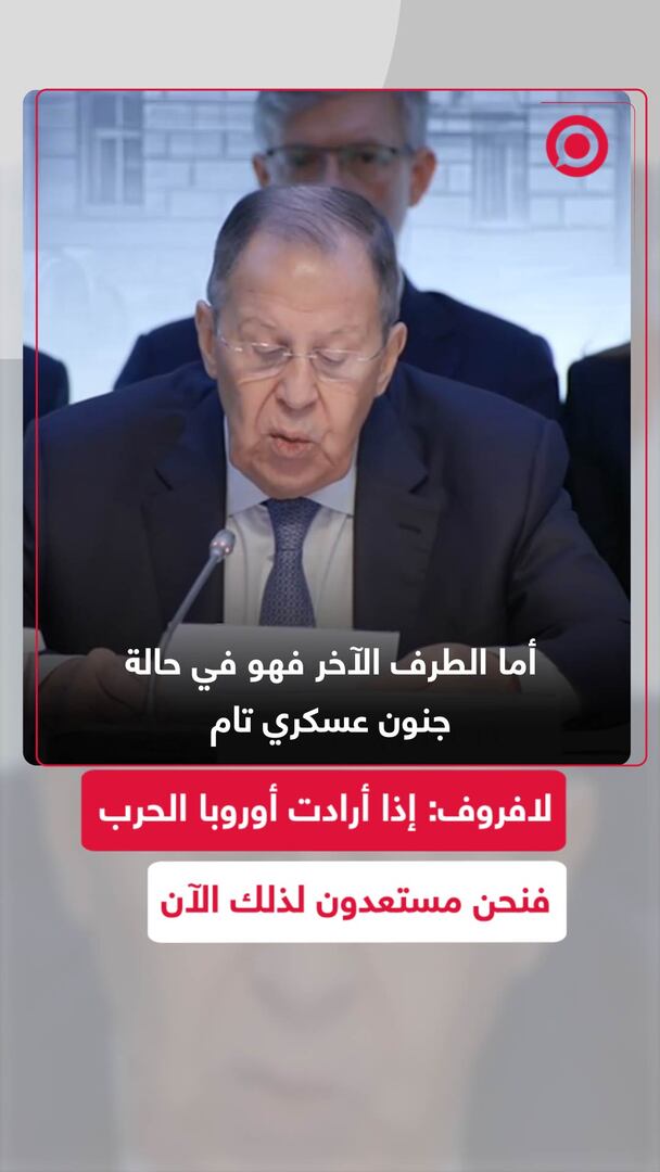 "إذا اختارت أوروبا طريق الحرب فنحن جاهزون الآن".. وزير الخارجية الروسي سيرغي لافروف يؤكد أن روسيا لا تملك خططا هجومية ضد الناتو أو دول الاتحاد الأوروبي ومستعدة لتوثيق هذه الضمانات خطيا، ولكن إذا رغبت أوروبا لمحاربة موسكو عسكريا فليكن.