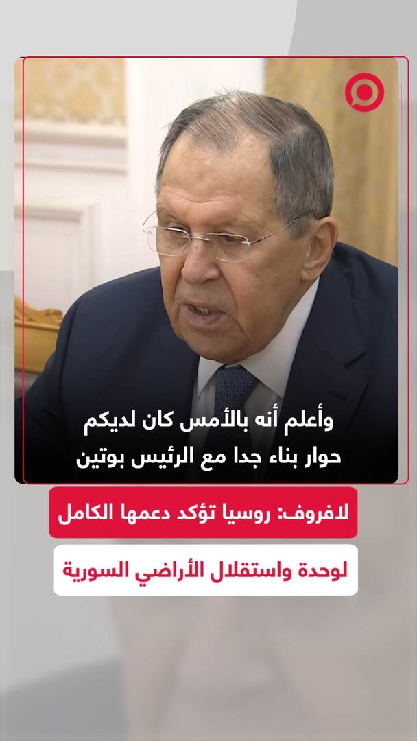 وزير الخارجية الروسي سيرغي لافروف، يؤكد دعم موسكو القاطع لوحدة واستقلال سوريا، مشددا على استمرار التنسيق الروسي السوري في القضايا الثنائية والإقليمية، حيث أشار إلى أن وزير الخارجية السوري أجرى لقاء مع الرئيس بوتين ناقشا خلاله العلاقات بين البلدين والتطورات في المنطقة وسبل تعميق التعاون