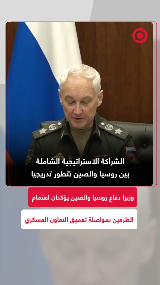 وزير الدفاع الروسي أندرريه بيلاوسوف ونظيره الصيني الأدميرال دونغ جون، أكدا اهتمام الطرفين بمواصلة تعميق التعاون بين جيشي البلدين لا سيما في ظل التغيرات الأخيرة في الوضع الدولي، وأشار بيلاوسوف إلى أحداث فنزويلا وإيران مؤكدا أنها تتطلب من وزارتي الدفاع الروسية والصينية تحليلا أمنيا مستمرا واتخاذ الإجراءات المناسبة.
