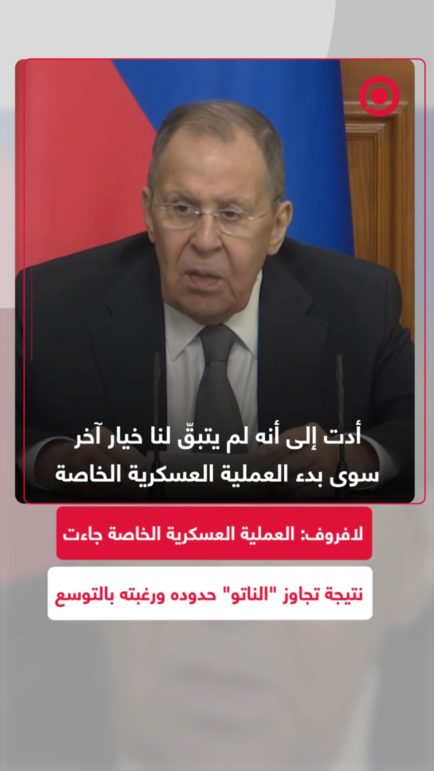 وزير الخارجية الروسي سيرغي لافروف يؤكد خلال المؤتمر الصحفي بأن العملية العسكرية الخاصة جاءت كاستجابة لتصرفات حلف "الناتو" الاستفزازية والساعية للهيمنة على المنطقة، مشيرا إلى أن محاولات الغرب في استقطاب أوكرانيا وتشكيلها كأداة ضد روسيا لم تترك لروسيا خيارا آخرا.