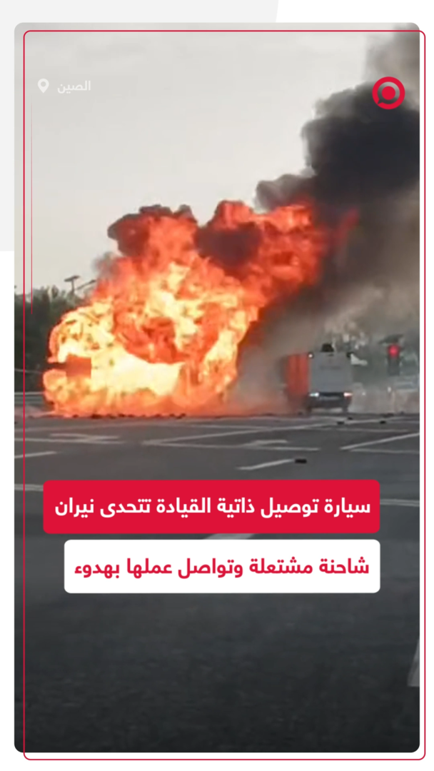 واصلت طريقها بشكل طبيعي.. لقطات متداولة لسيارة توصيل ذاتية القيادة تمر بهدوء تام من جانب شاحنة مشتعلة في الصين، مواصلة عملها في تسليم الطرود دون أي تدخل بشري. #الصين #توصيل #فيديو
